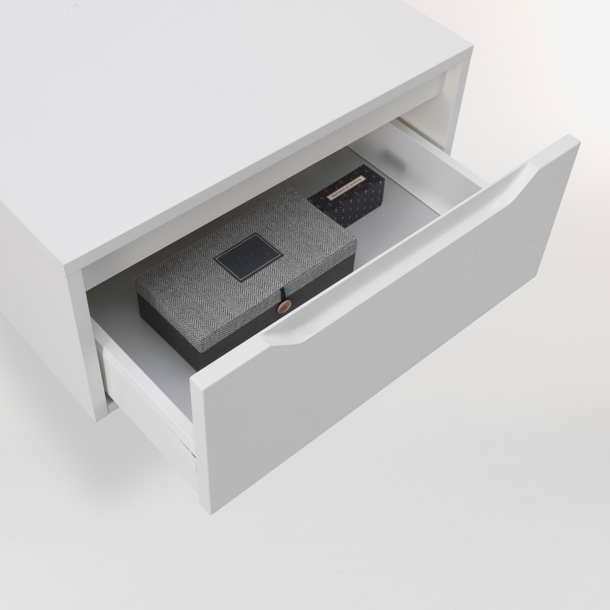 Base sospesa laccata bianco opaco, nr.1 cassetto con scorrimento e chiusura soft close, in mdf rivestito pvc bianco opaco e maniglia a gola integrata.