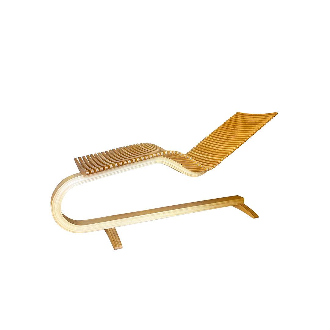 Chaise Longue realizzata a mano in legno di Abete di prima scelta. Il copro è formato da diversi strati di legno incollati e modellati per accogliere e supportare la persona durante la seduta.